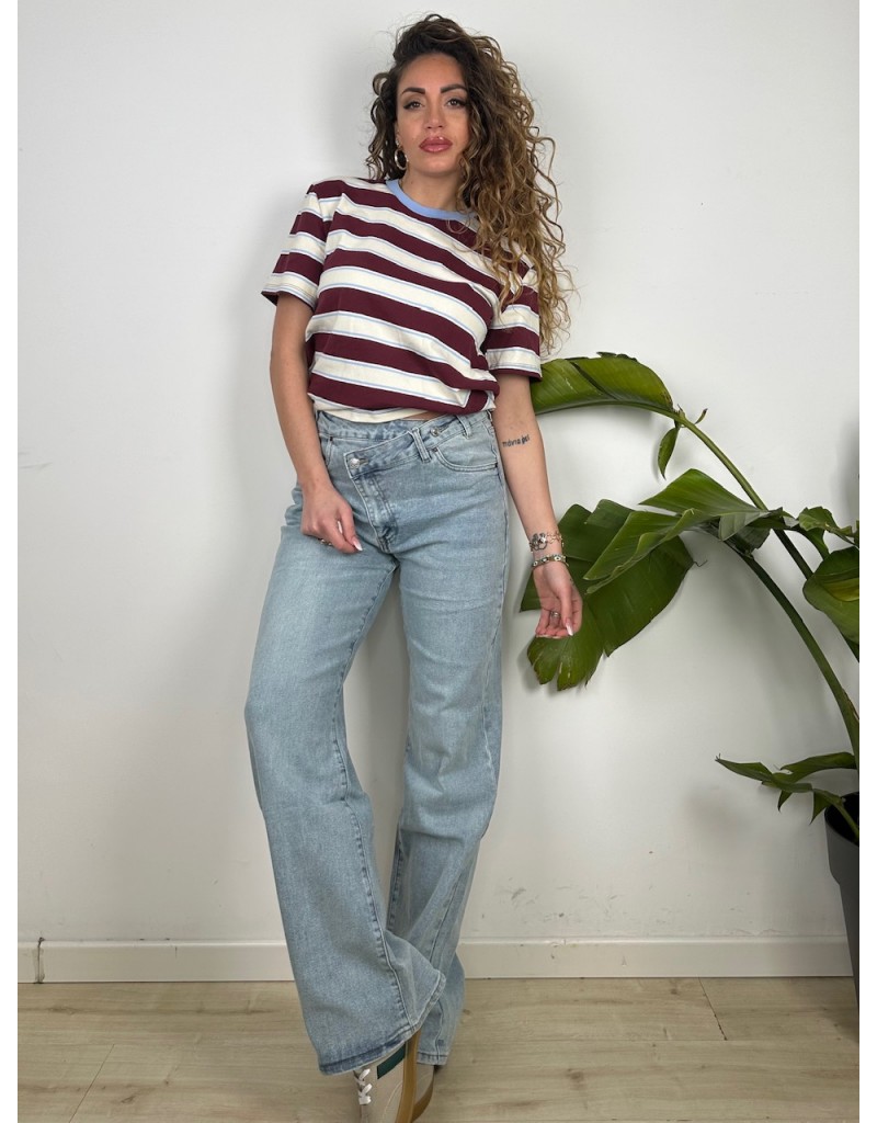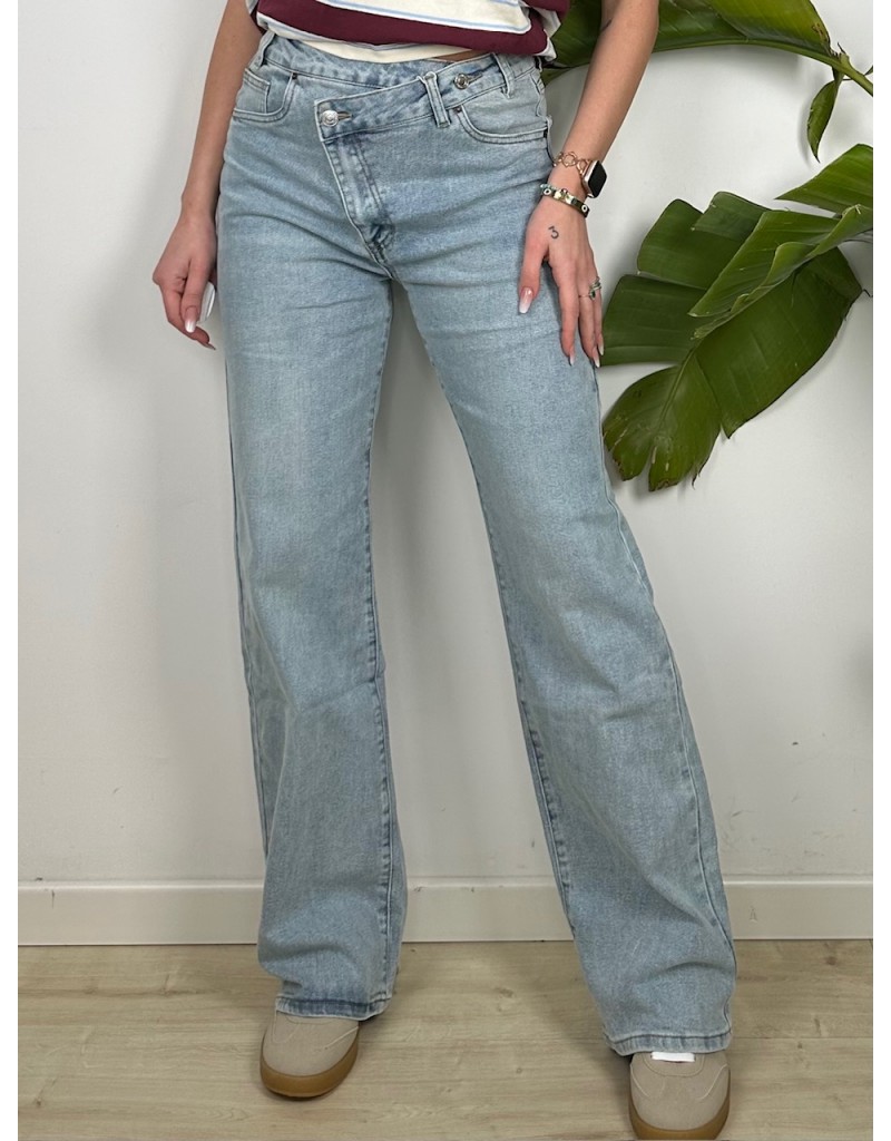Jeans Modello Wide leg con chiusura a 2 bottoni trasversale.