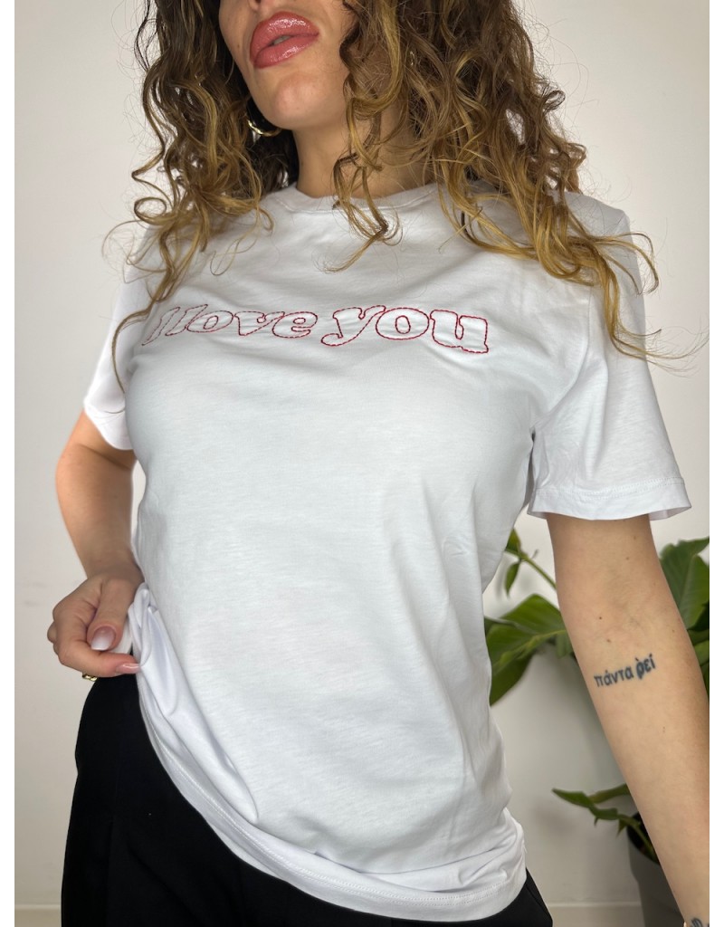 T-Shirt con scritta in ricamo rossa.