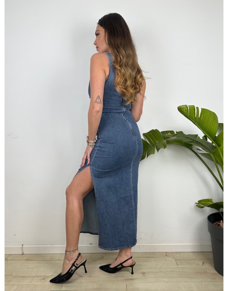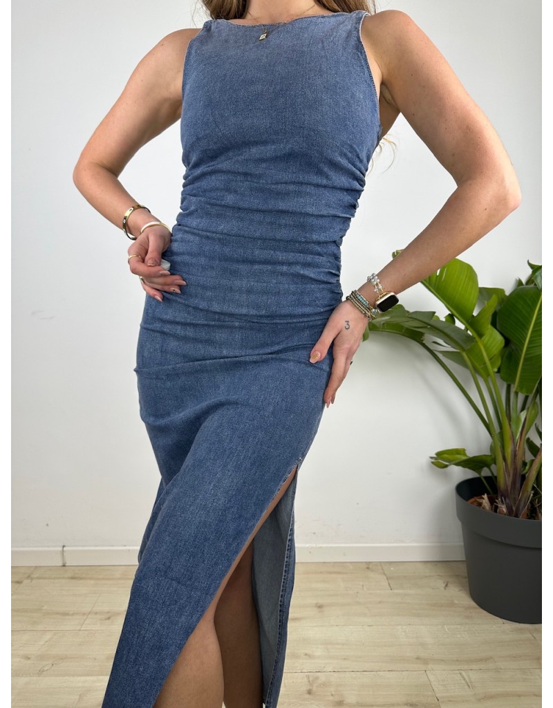 Vestito tubino in jeans con arricciature e chiusura a zip posteriore.