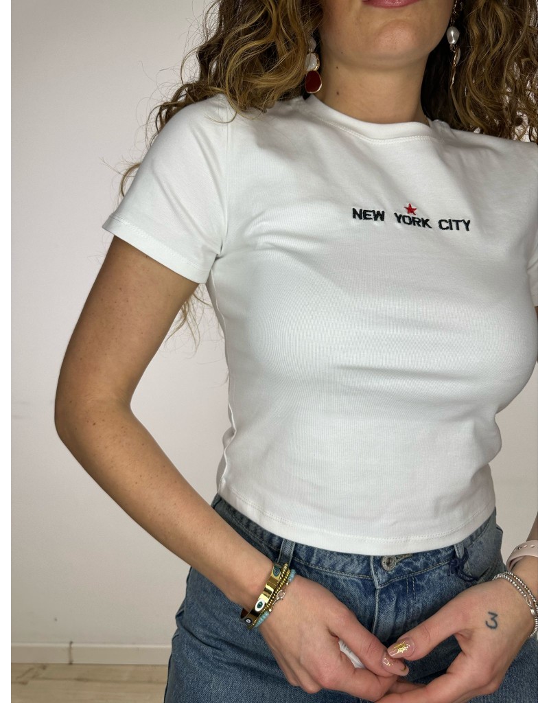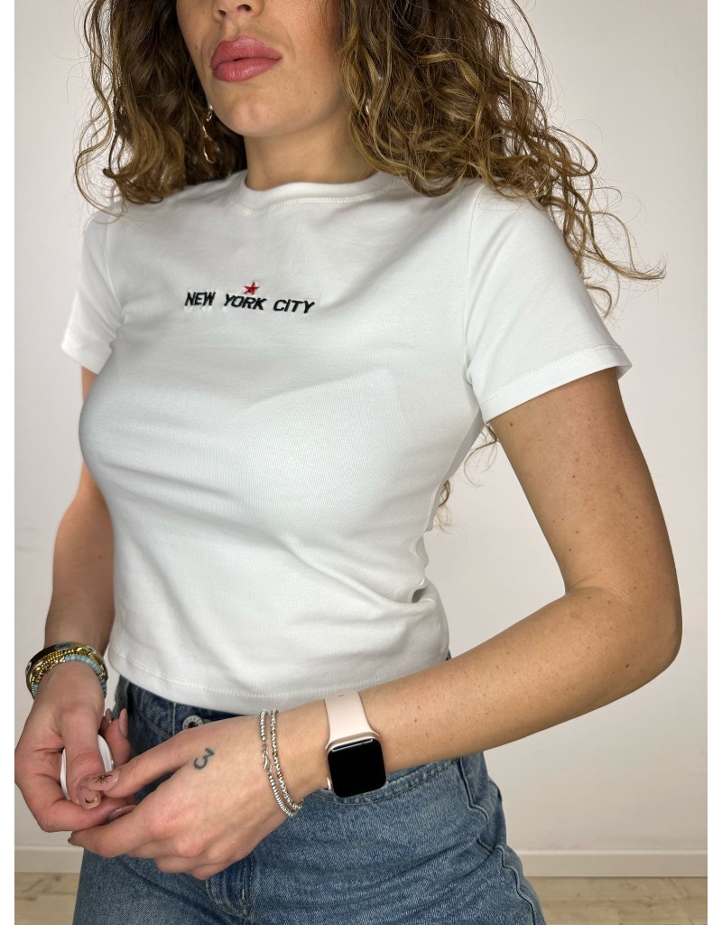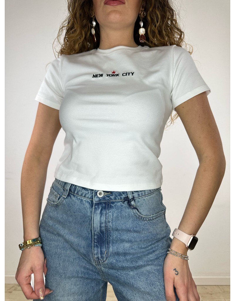 Shirt crop a manica corta con scritta frontale.
