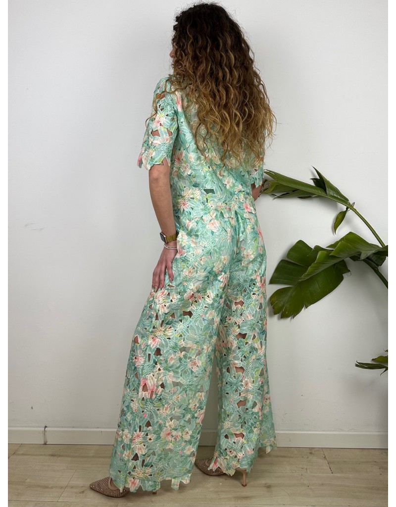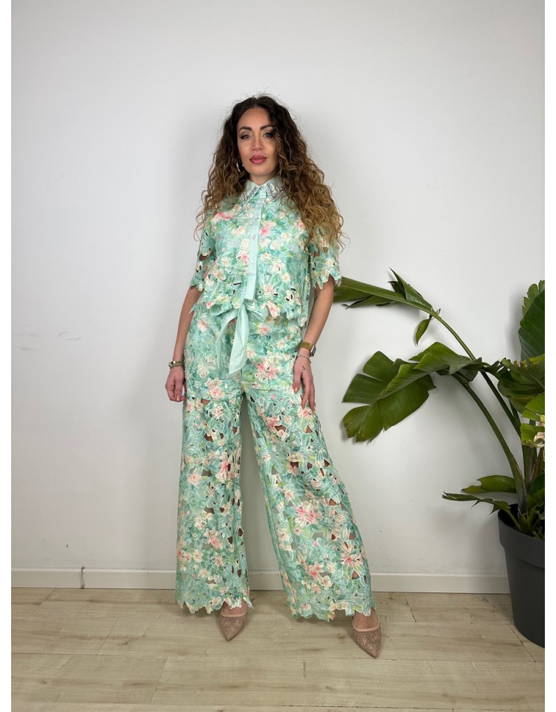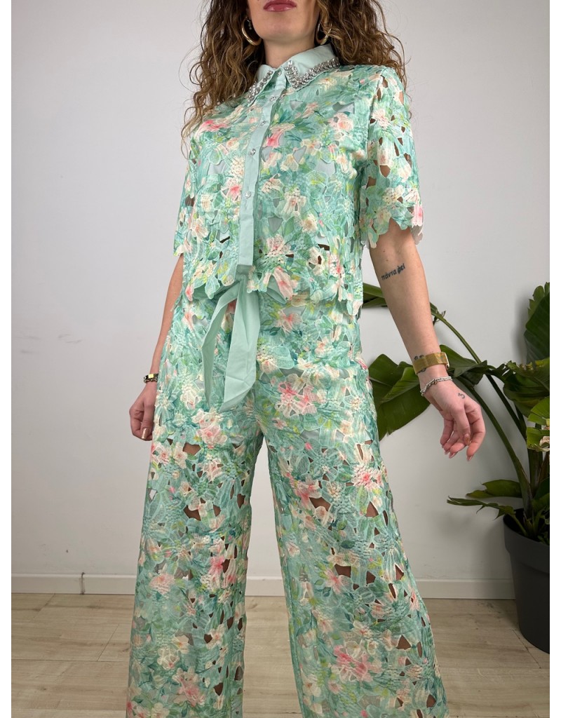 - Pantaloni con cintura in tessuto, ricamo a fiore.