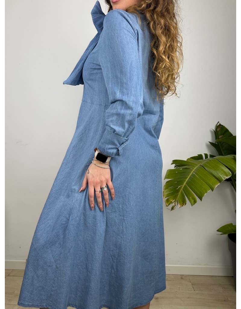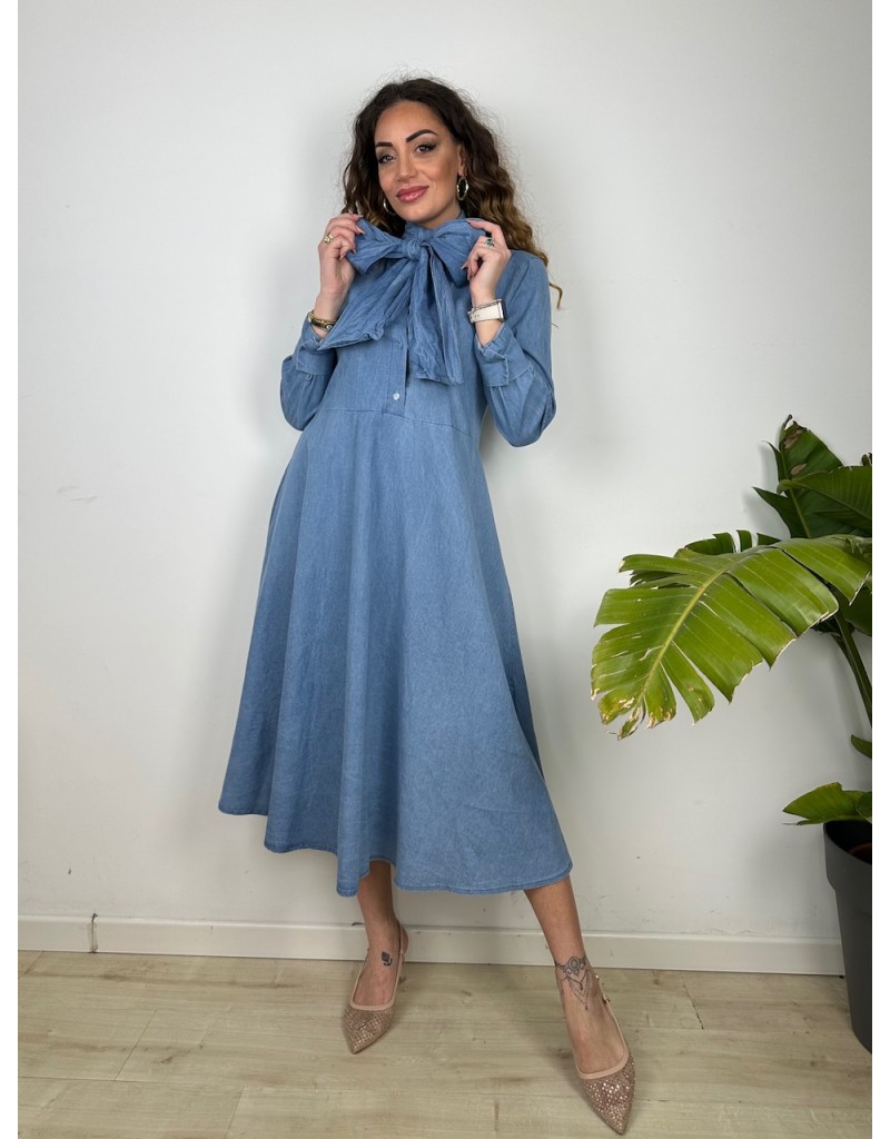 Vestito lungo modello chemisier con fiocco in denim leggero.
