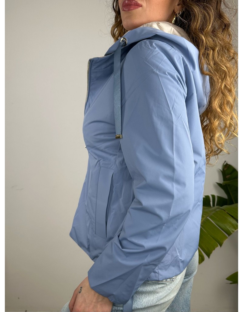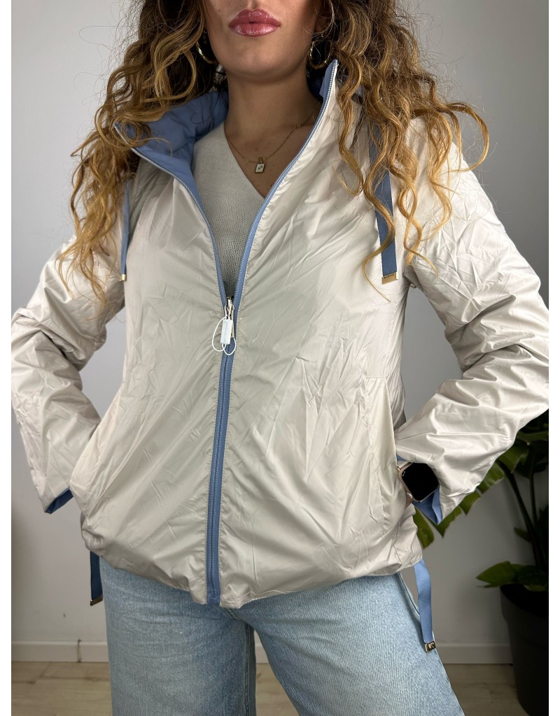 Giubbino primaverile double face con cappuccio,chiusura con cerniera frontale.