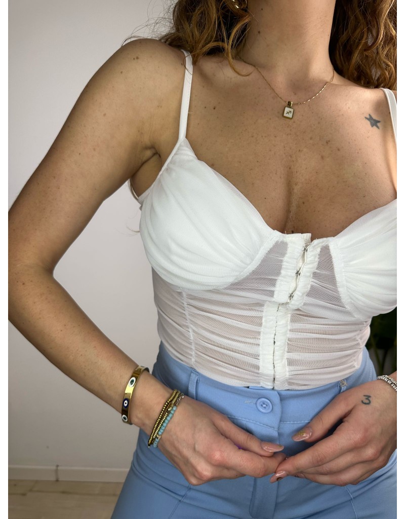 Body con bretelle sottile e con coppette interne.Chiusura con gancetti sulla parte frontale