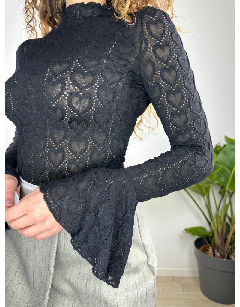 Maglia in pizzo a mezzo collo,manica lunga con volant.