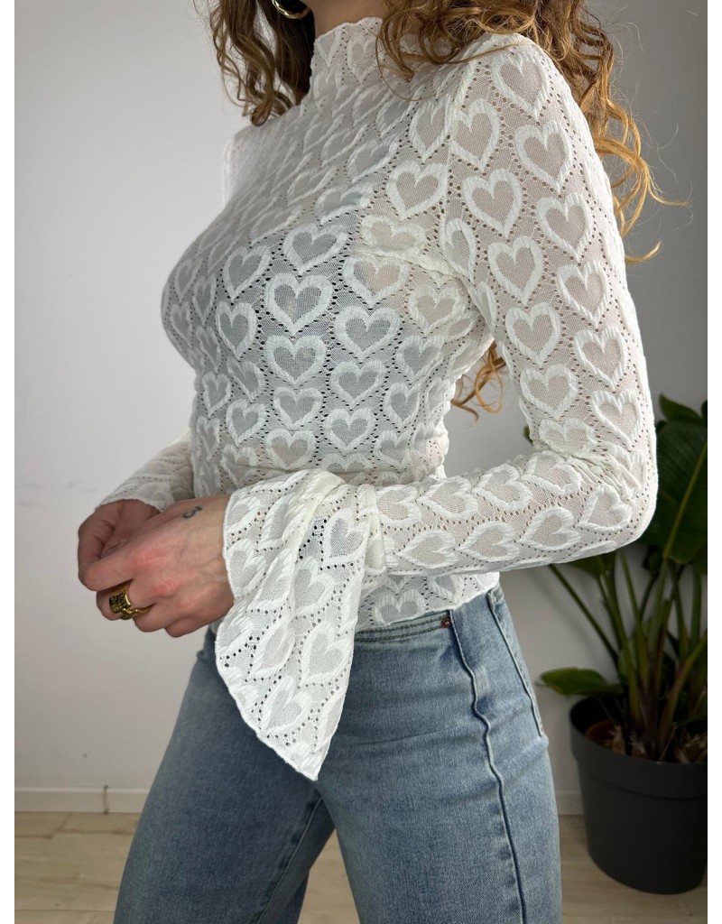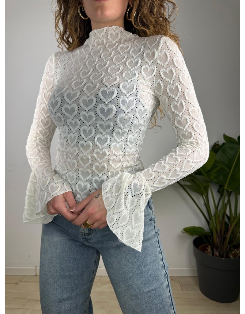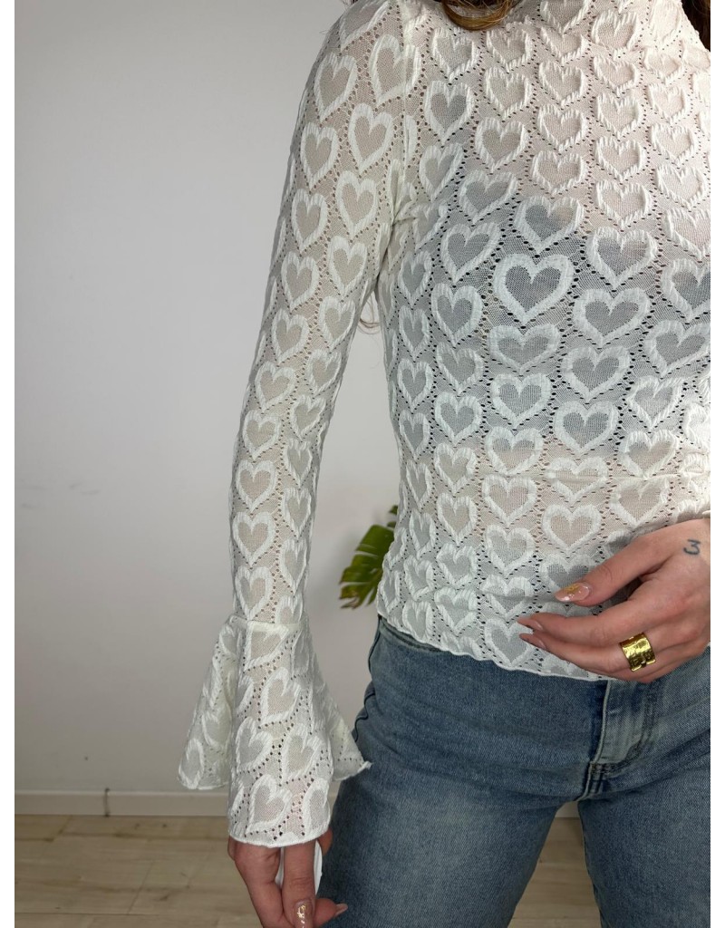 Maglia in pizzo a mezzo collo,manica lunga con volant.