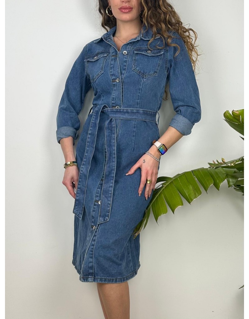 Dress denim aderente,chiusura con bottoni metallici e cintura in vita.