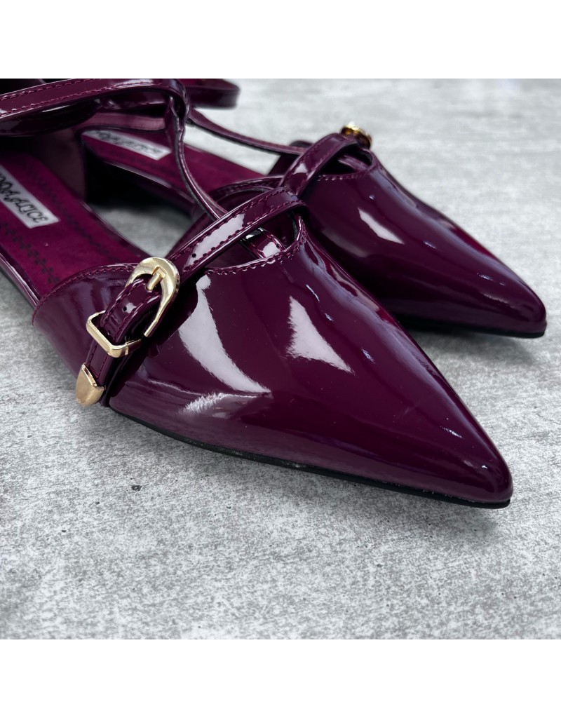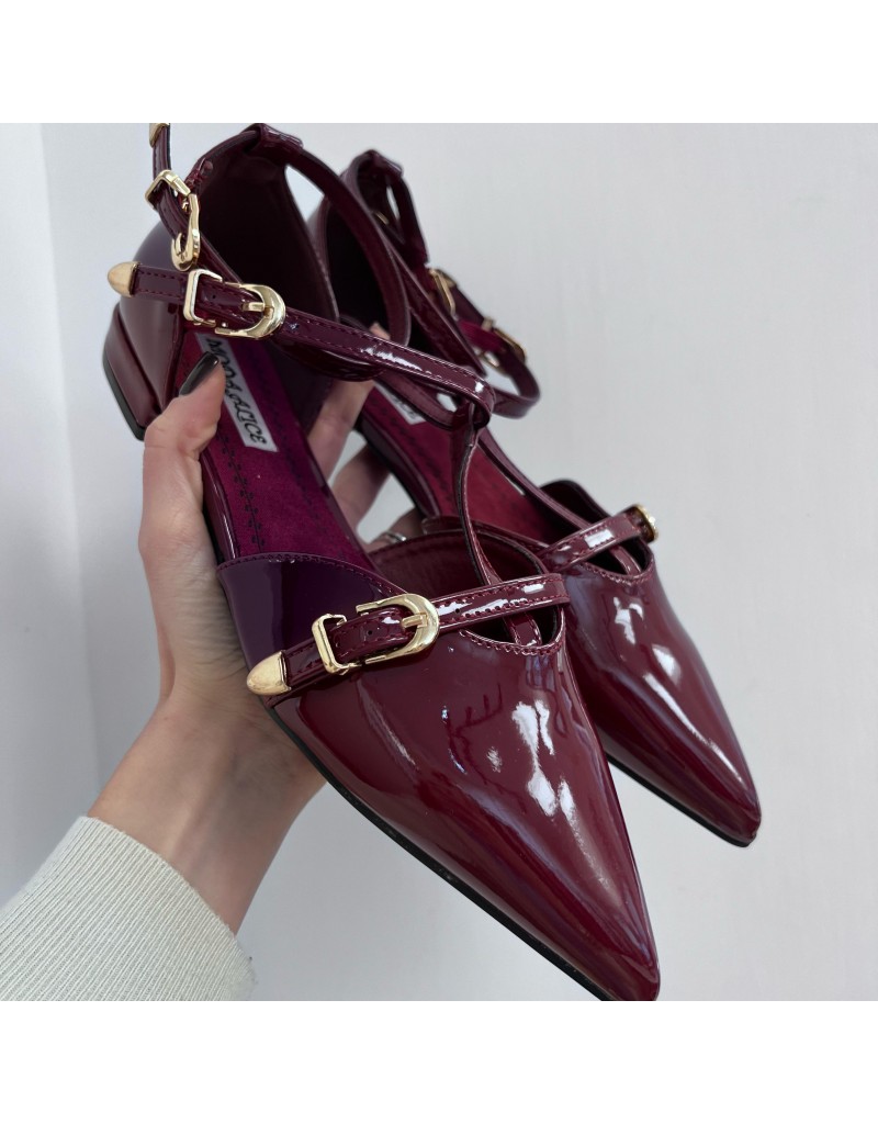 Ballerina bassa a punta in ecopelle lucida, chiusura con doppio cinturino.