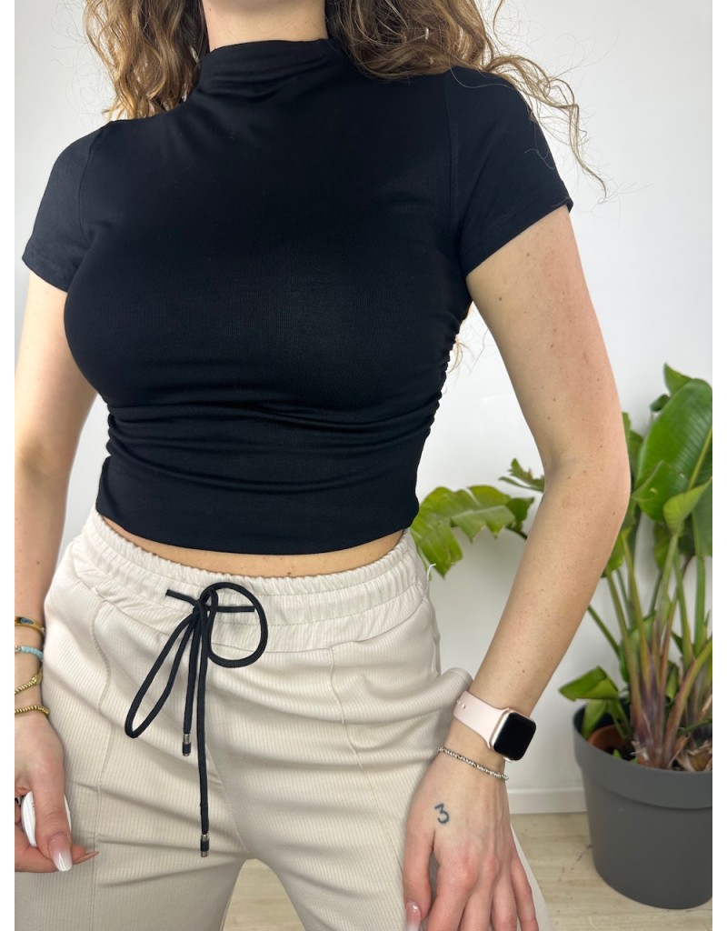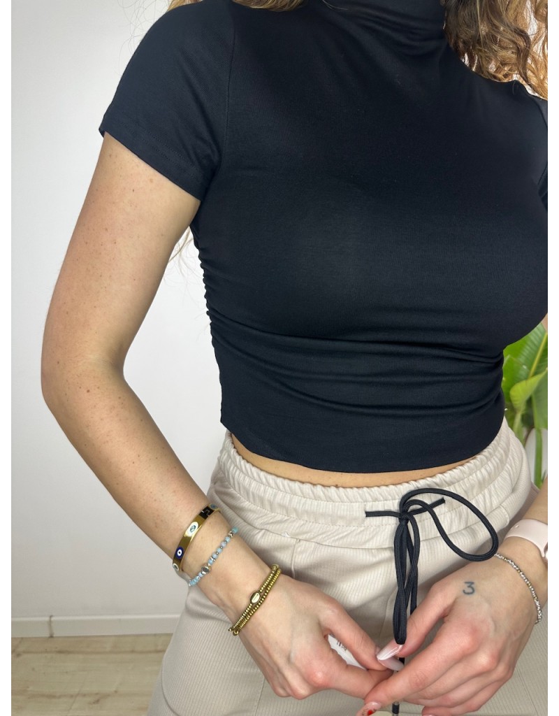 T-Shirt con mezzo colletto e arricciatura laterale.