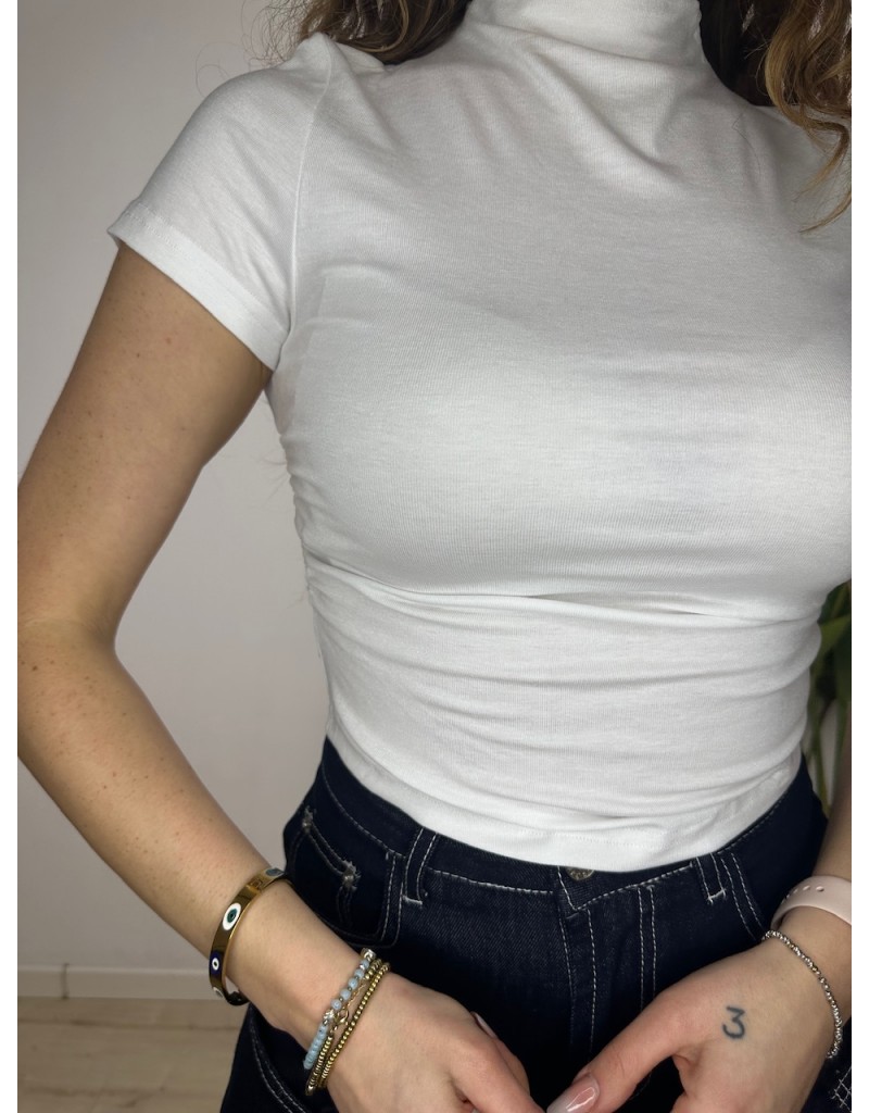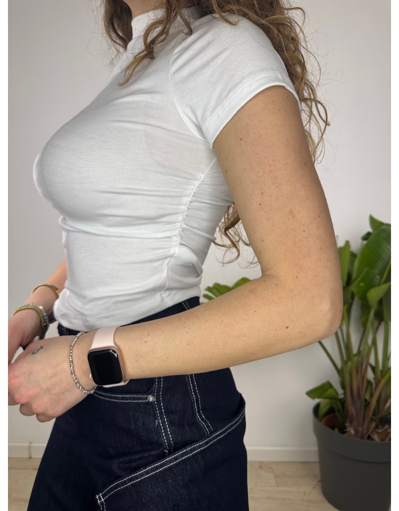 T-Shirt con mezzo colletto e arricciatura laterale.