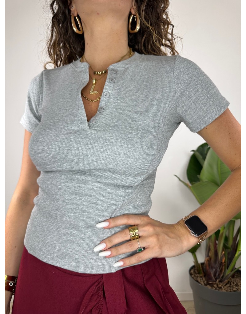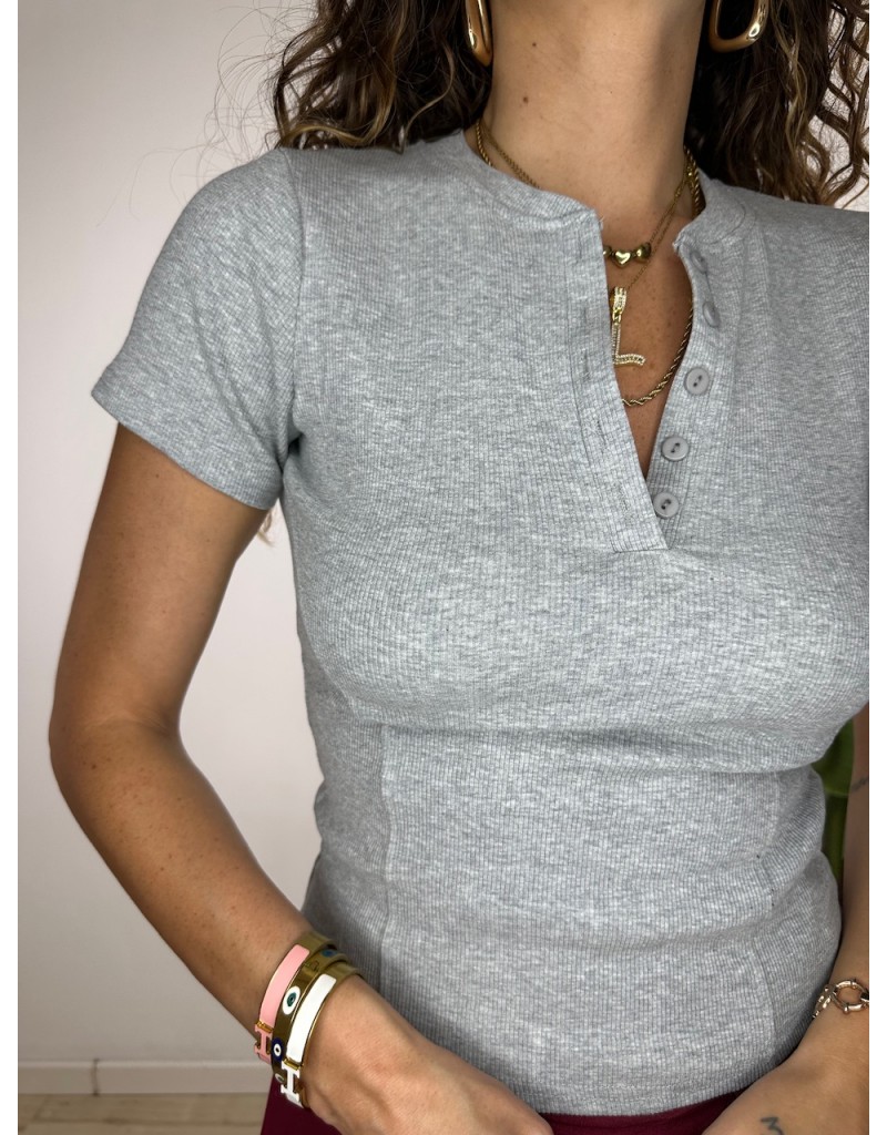 T-Shirt modello Crop a costine con chiusura a giappette.