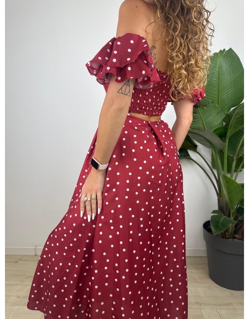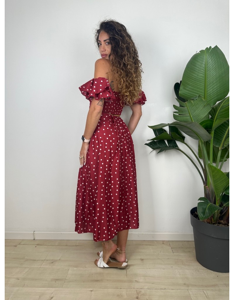Long dress a poi con scollatura a barca, fantasia pois.