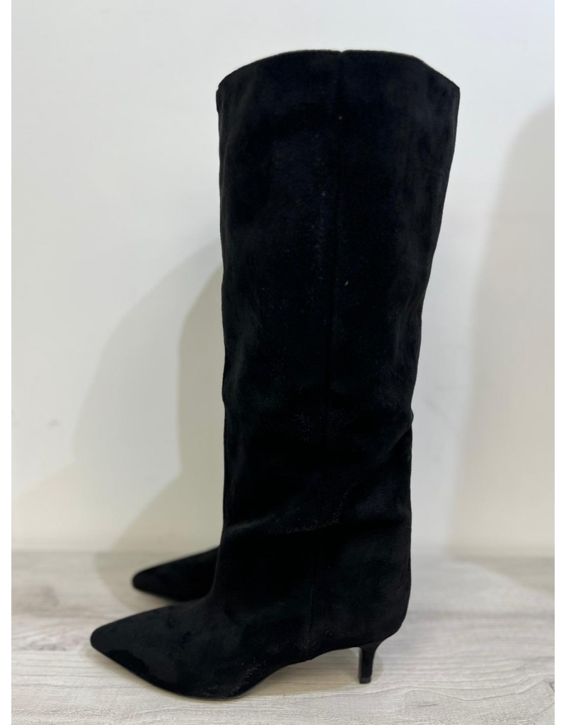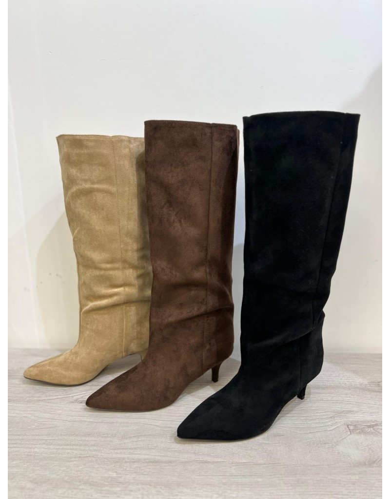 Stivale in eco pelle scamosciata . Gambale alto e largo .Facile da indossare. Tacco kitten e finitura a punta.