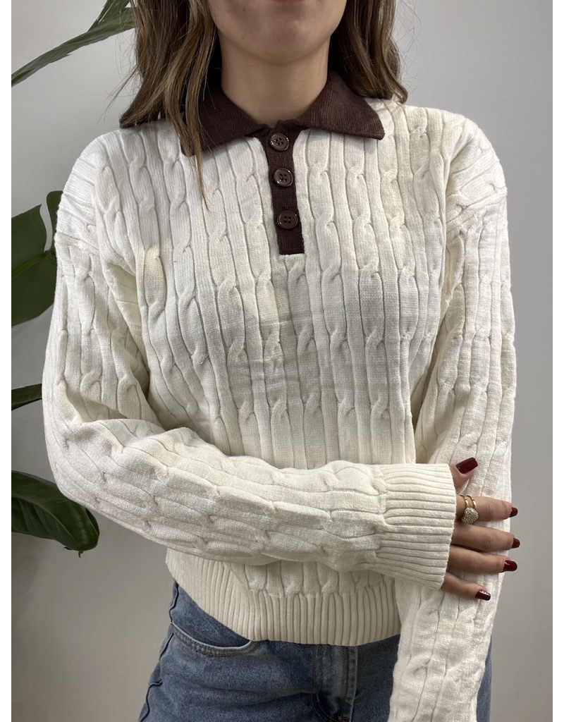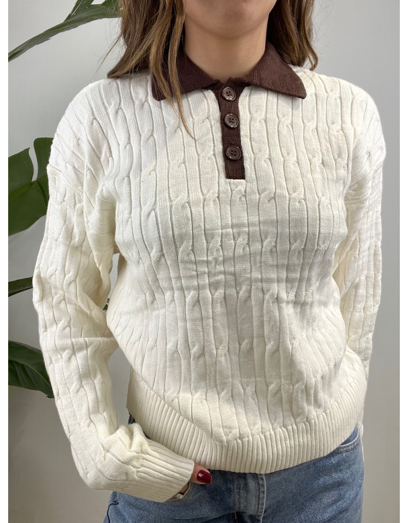 Pullover modello polo con colletto a contrasto e treccioni.