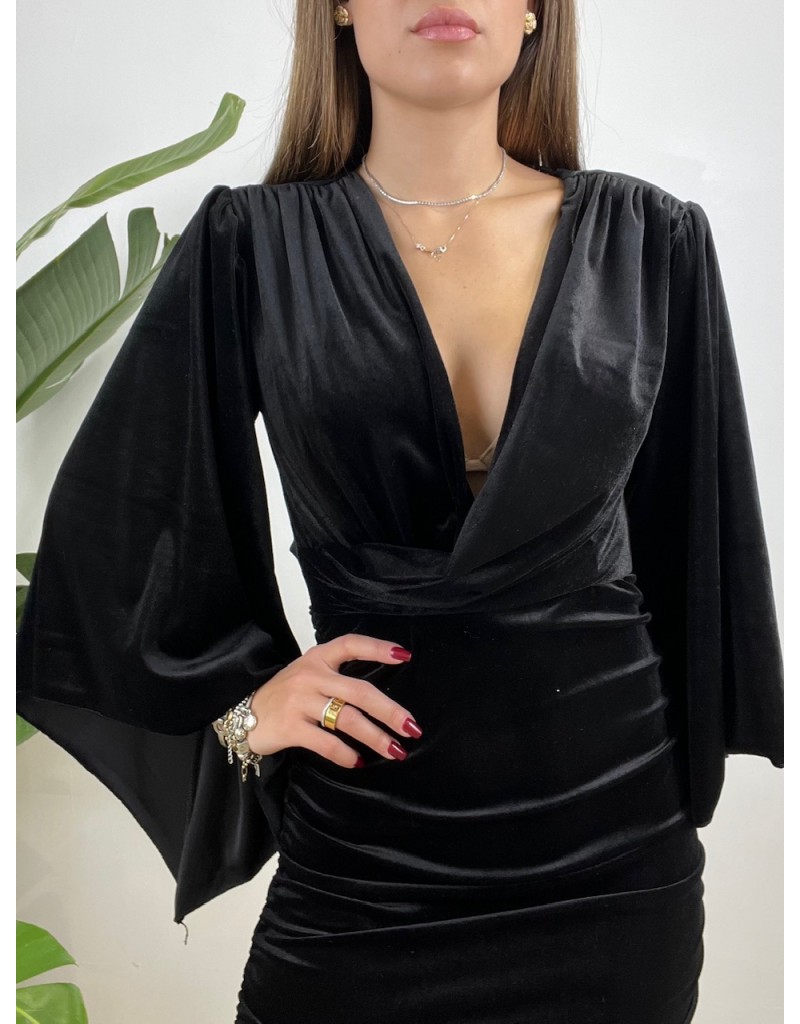 Vestito in ciniglia con scollatura posteriore.