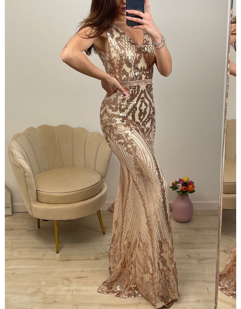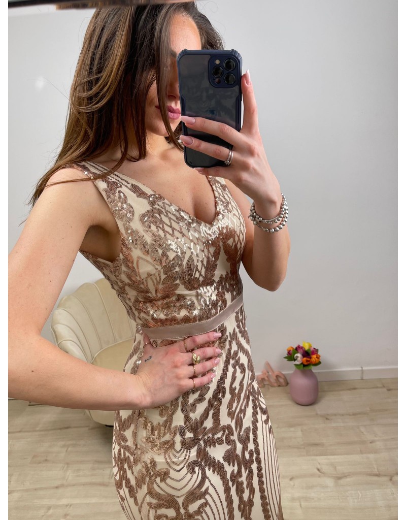 Long dress con ricami in oro,con spallina larga,scollatura a "V",con piccola fascia sotto al seno.